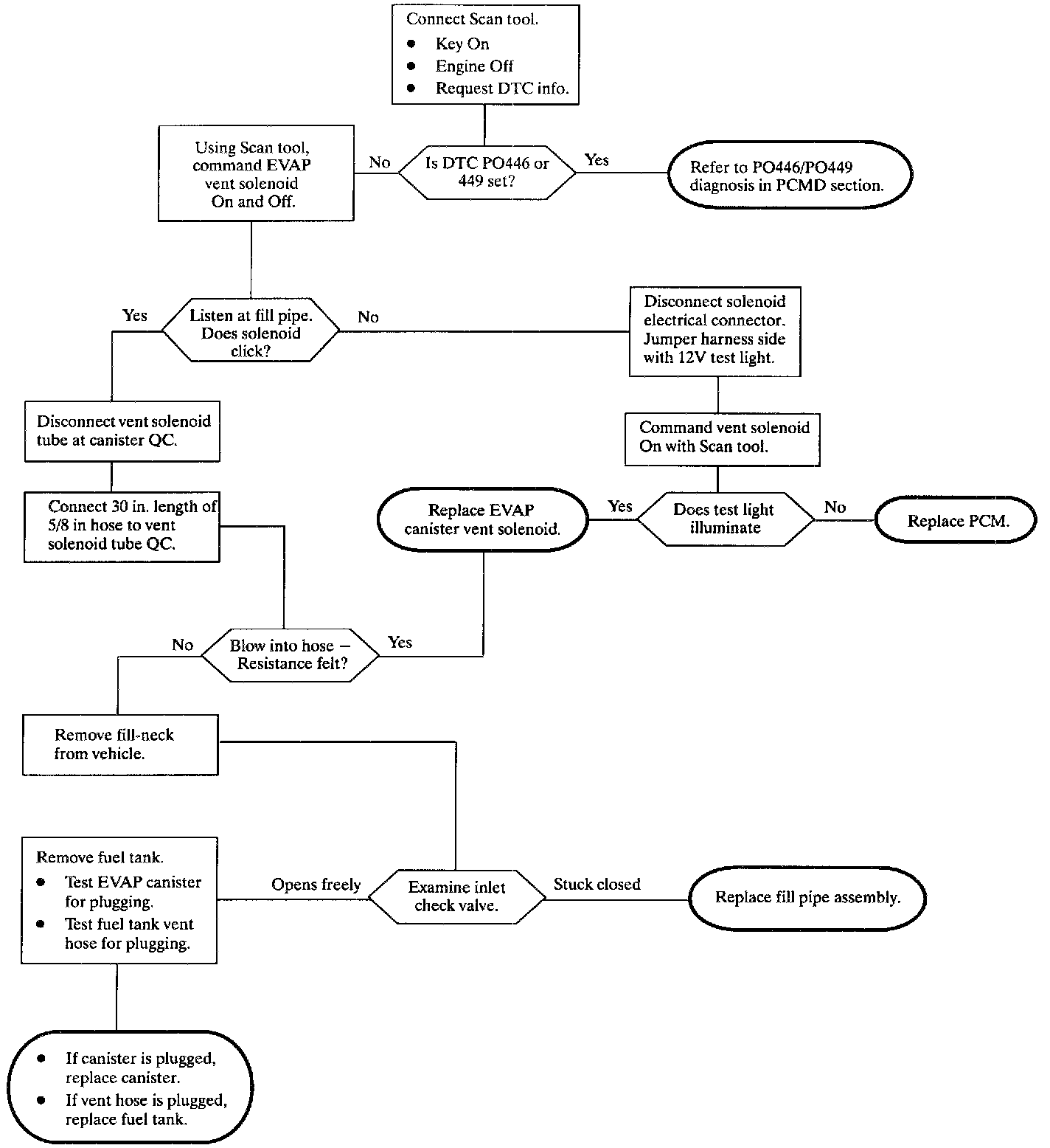 - Check vent path from [1][2]EVAP vent solenoid backwards to isolate problem component (vent solenoid, vent pipe/hose, canister, FLVV (fill limit vent valve), etc.