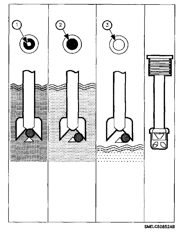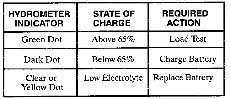 NOTE: Before determining that the battery needs to be replaced, lightly tap the eye of the hydrometer to ensure that gas bubbles have not lodged themselves in the hydrometer. If the battery needs replacement, check the charging system for proper operation.
