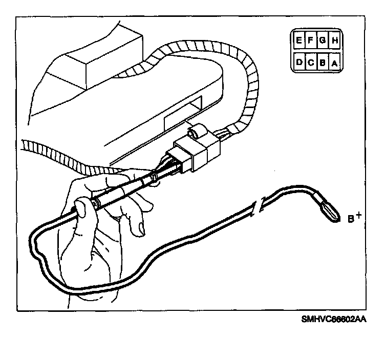 1. Locate the ORN wire at cavity H of the delayed blower motor control module and insert a metri-pack 280 series male test adapter into cavity H until contact is made with GRN wire terminal in the delayed blower motor control module pigtail connector.