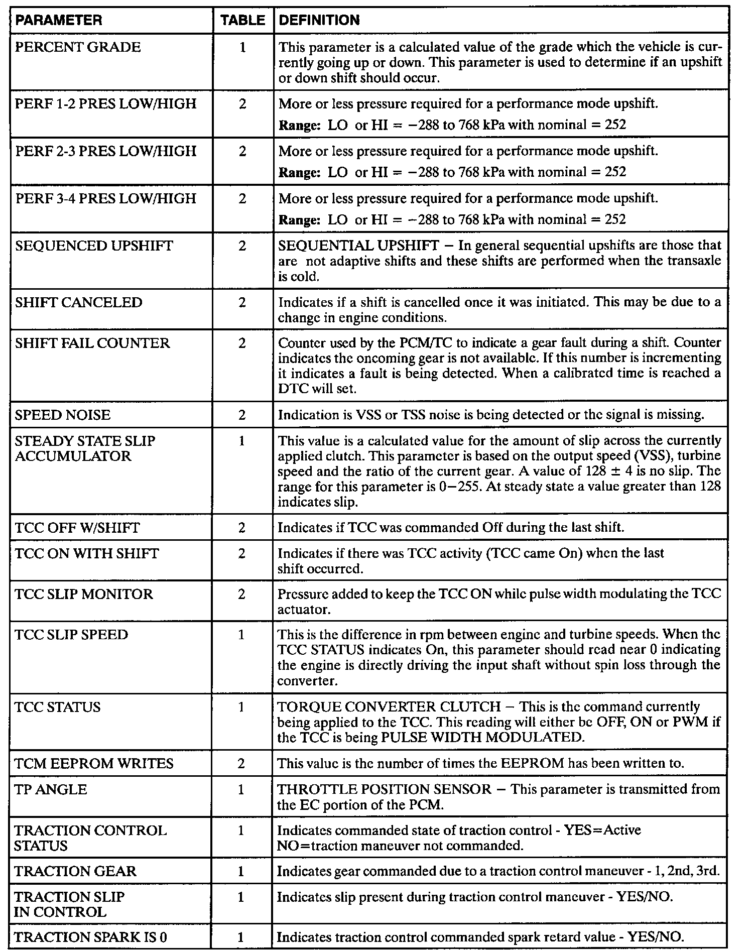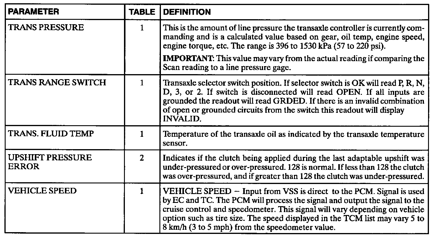The Transaxle Controller Module (TCM) data definitions shown are intended to assist in understanding the data displayed by a Scan tool when it is communicating with the transaxle controller. A thorough understanding of this data will not only aid in diagnosing transaxle related problems, but will also help eliminate unnecessary repairs.