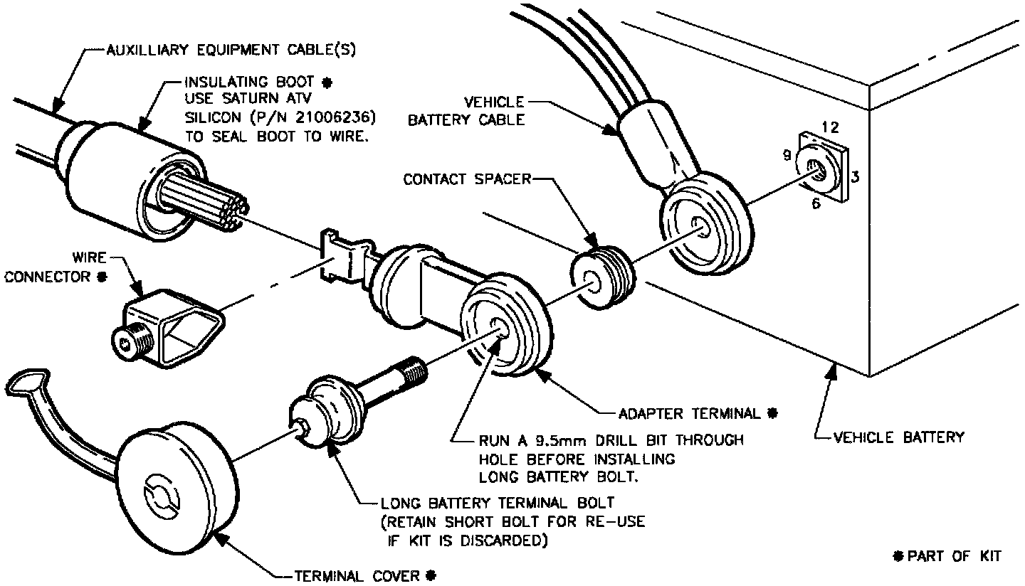 - The adaptor terminal must be located at a 2 to 5 o'clock position or if need be, between a 6 and 7 o'clock position. If adaptor terminal is placed between a 7 and 1 o'clock position, loosening of the battery terminal bolt will occur.