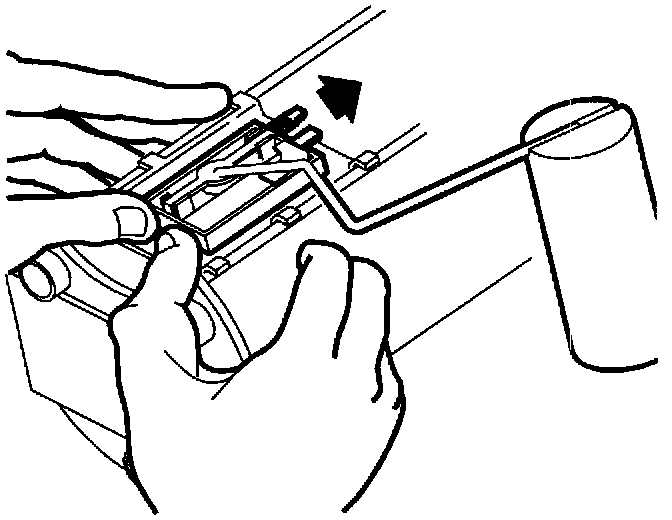 3. Grasping the fuel pump module in both hands and placing both thumbs at the bottom of the fuel sending unit, firmly press the sender toward the top of the module to disengage the bottom attachment tang.