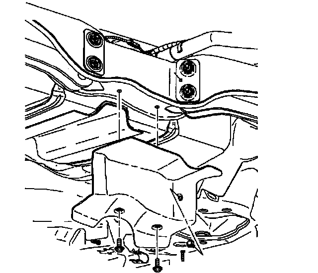 2. Remove fuel tank heat shield to rear suspension support fasteners.