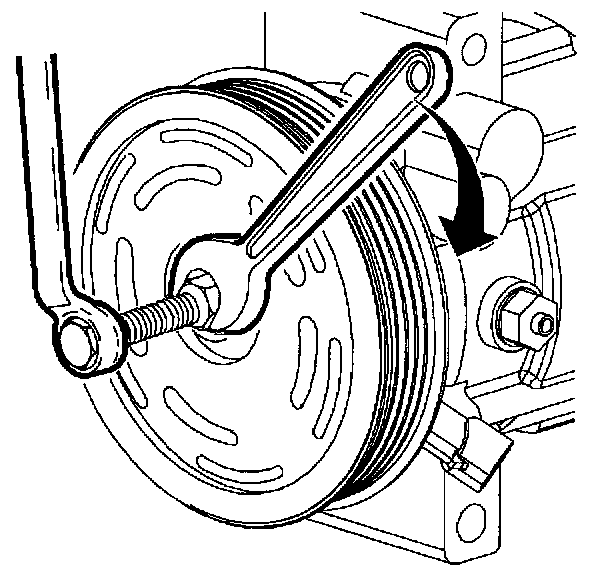 4. Hand tighten nut on installation bolt to align pulley to A/C compressor. While holding end of bolt, tighten nut until pulley bottoms out on A/C compressor.