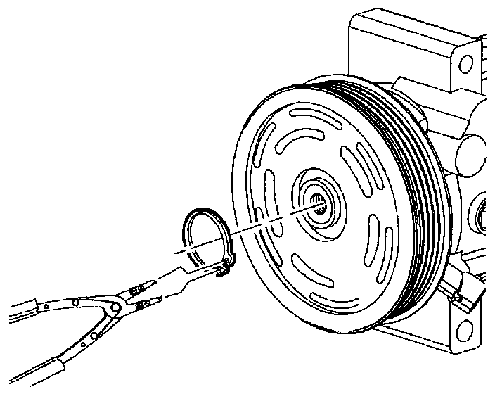 NOTE: Do not remove pulley without puller adapter. If A/C compressor shaft is pressed on, A/C compressor will be damaged.
