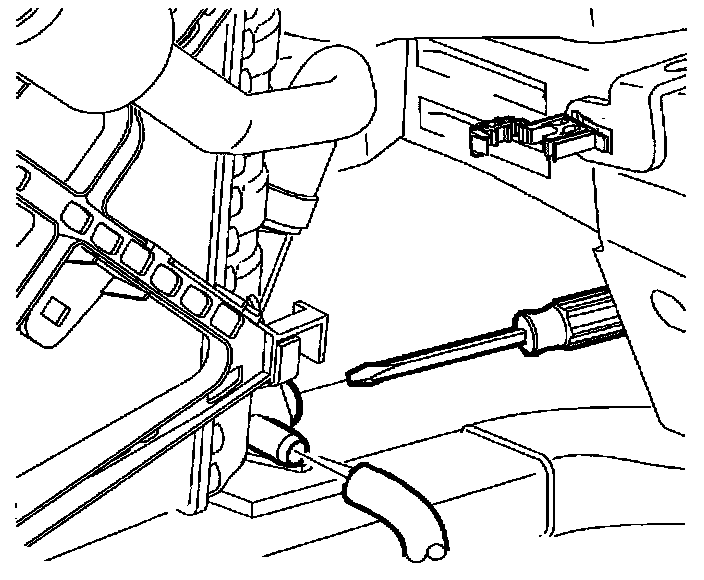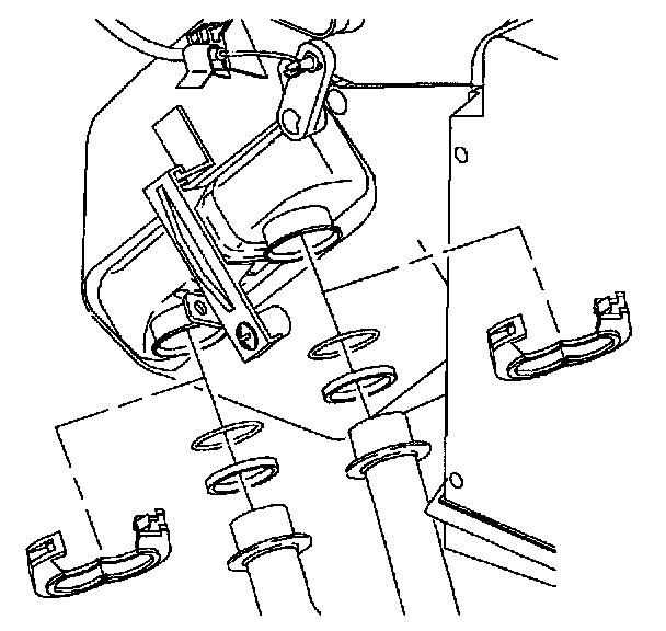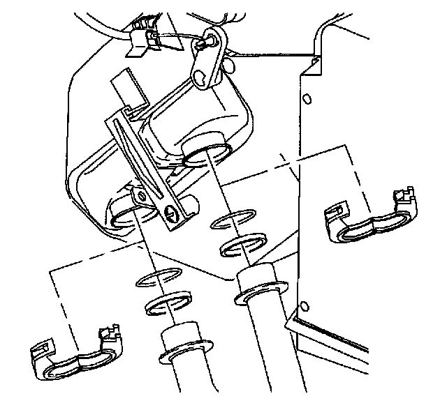 14. Remove heater core pipe to heater core clamps. Clamps may need to be rotated to gain access to clamp retaining tab.
