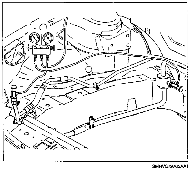 2. Install a manifold gauge set to high and low side service ports making sure gauge set is visible from inside the vehicle.