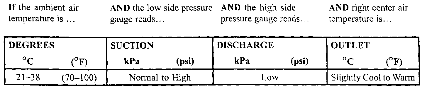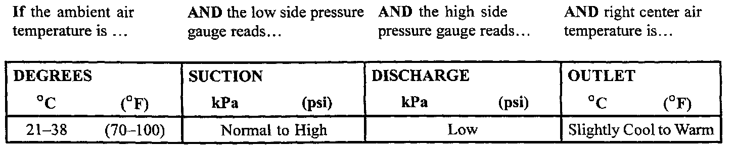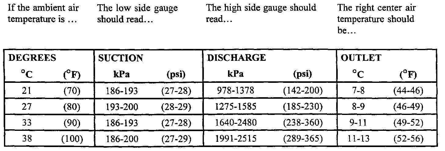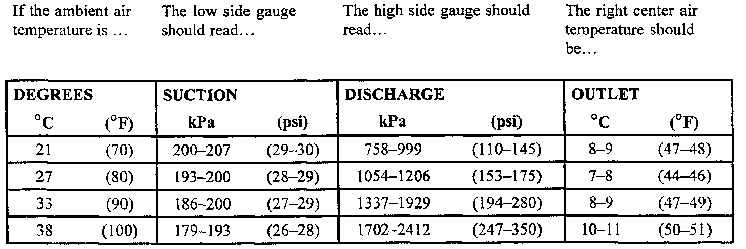 ^ If values do not match either "Normal System Performance" or "Low Refrigerant Charge" charts, match the values with the appropriate chart in the 2000/2001 L-Series HVAC Service Manual and make necessary repairs. When repairs are completed make sure to torque suction pipe and discharge line bolts to the specified torque value. Refer to L61 or L81 Suction Pipe and Discharge Line Torquing Procedure in this bulletin.