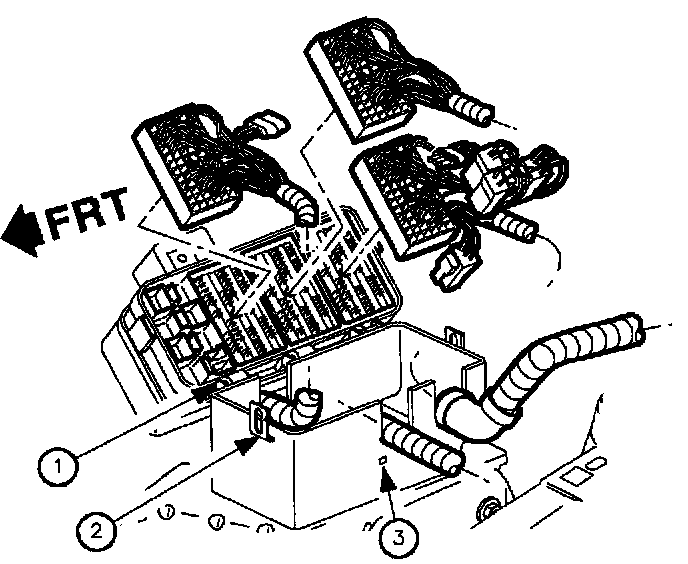10. Push in tabs (3) on the end of the fuse block case and roll back the fuse block (1).