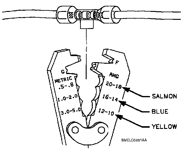 5. Using Saturn approved crimp and seal splice sleeve (found in special tools kit SA9138Z), position stripped ends of wires in sleeve until wires hit stop.