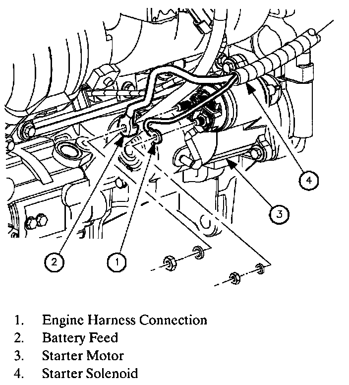 3. Disconnect two starter solenoid electrical connections.