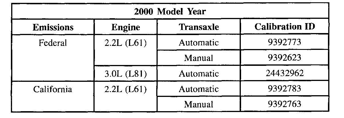 Install new ECM/PCM calibration according to the following calibration table. Refer to "Service Programming System (SPS)" in the Saturn Service Stall System (SSS) User Guide for reprogramming procedures.