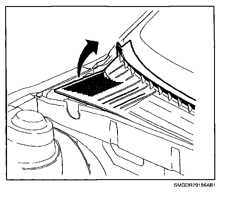 2. Raise right side front corner of air inlet grill in order to access 4 connector boot attachment nuts.