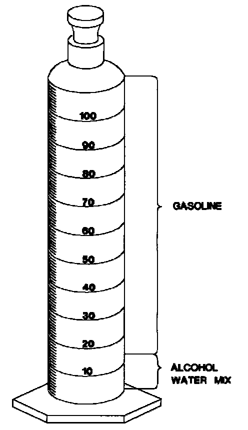 If alcohol is present in fuel, the volume of the lower layer, which would now contain alcohol and water will be greater than 10 ml. For example, if the volume of the lower layer is increased to 15 ml it would indicate at least five percent alcohol in fuel. The actual amount of alcohol may be somewhat greater because this procedure does not extract all of the alcohol from fuel.