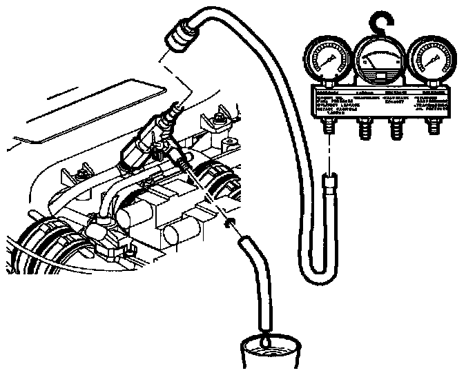 CAUTION: Whenever fuel line fittings are loosened or disconnected, wrap a shop cloth around fitting while connecting gauge, to collect fuel place the cloth in an approved container.