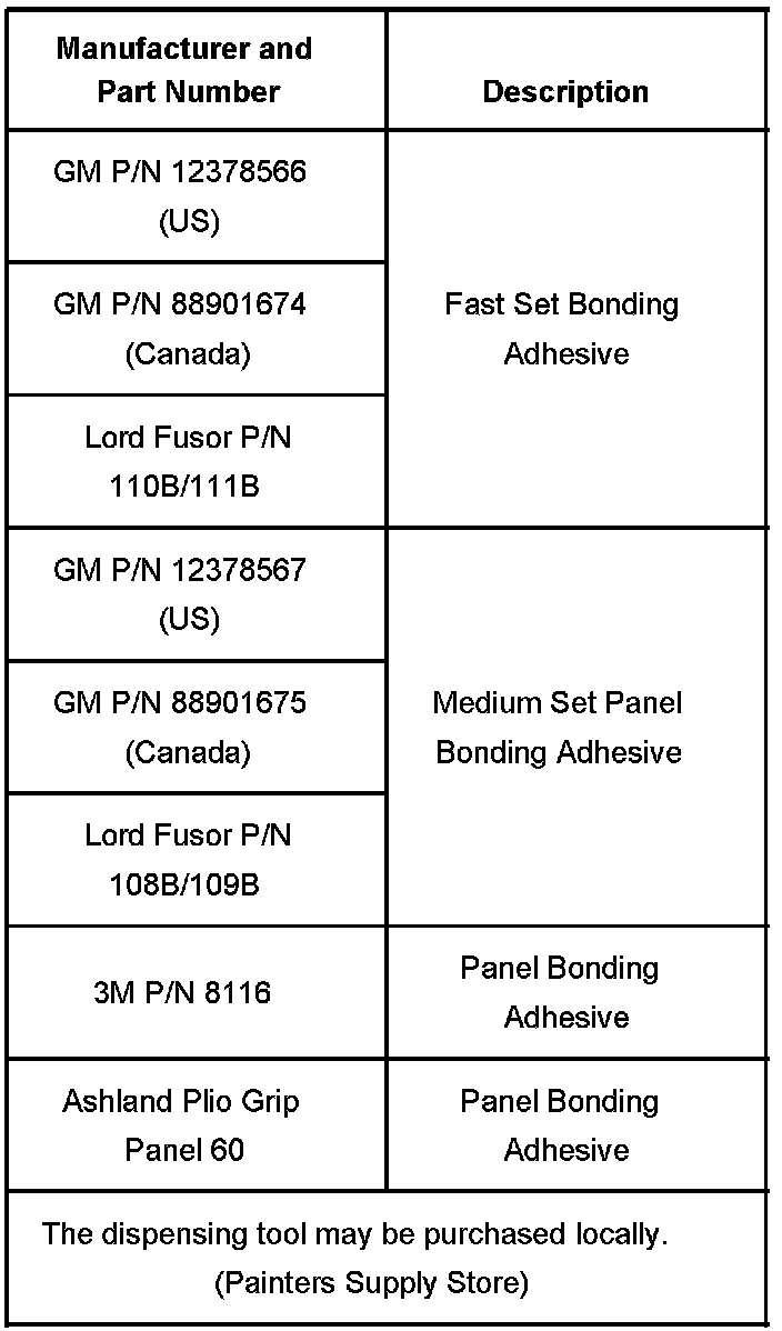 Adhesives currently meeting the performance requirements include General Motors materials, Lord Adhesives, Ashland Plio Grip, and products manufactured by 3M Corporation. At this time, ONLY the adhesive products shown meet this guideline.