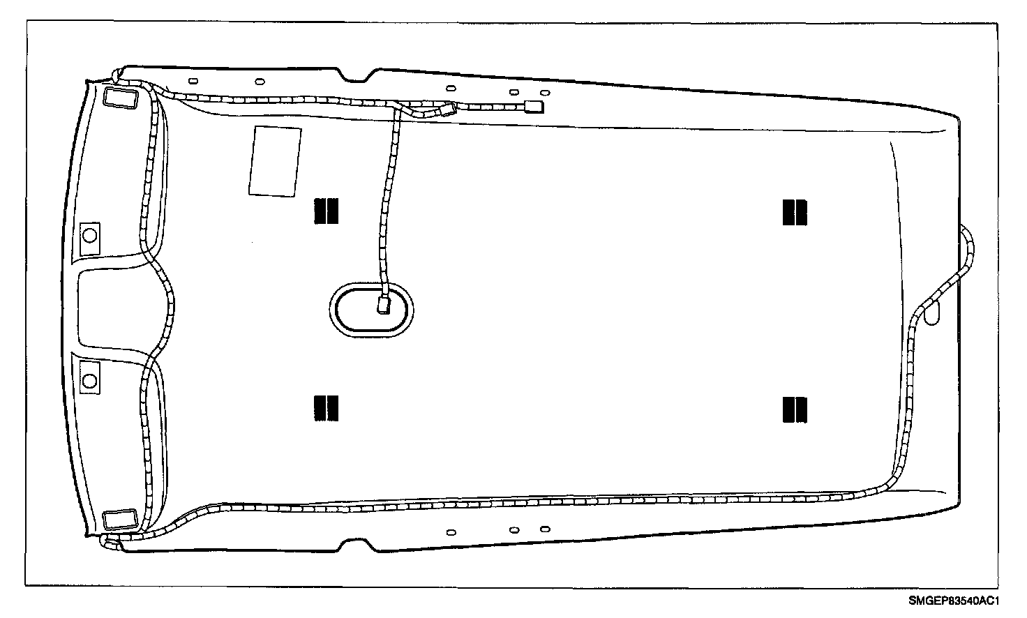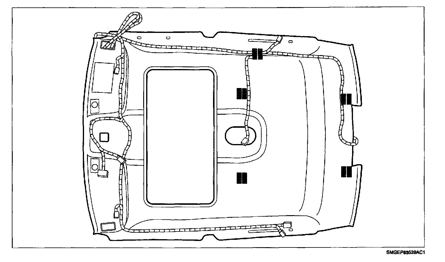 ^ Install two soft foam spacers on dome lamp wiring harness loop on passenger side of headliner.