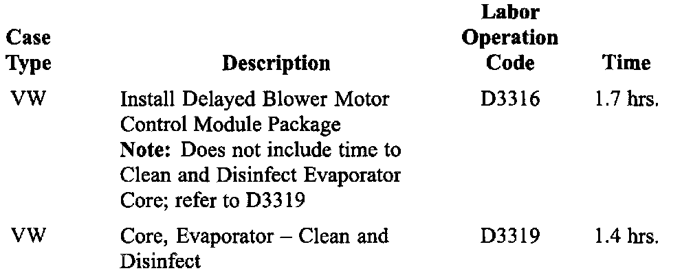 When it is necessary to clean and disinfect the HVAC system at the same time the delayed blower motor control module package is installed, submit labor operation D33 9 as a "related line" to failed labor operation D3316.