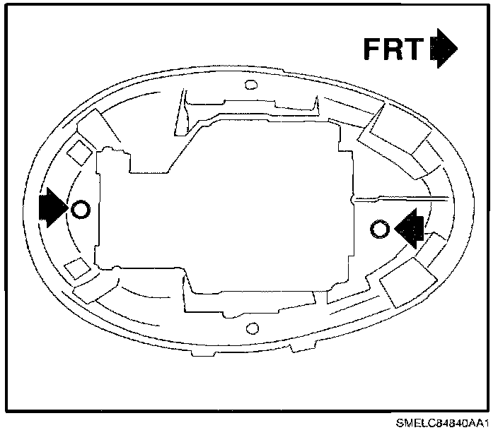 7. Locate the circles molded in the surface of dome lamp assembly. One is in either of the front reading lamp bulb mounting areas and one is in the dome lamp bulb mounting area.