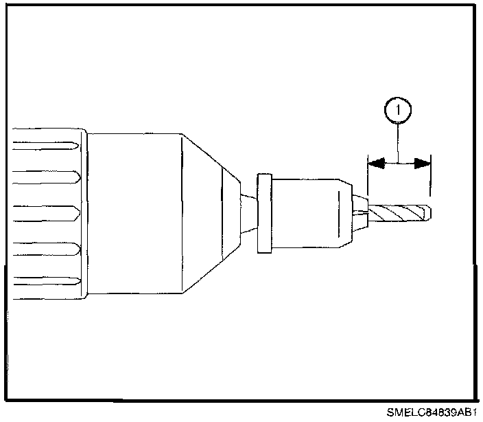 13. Install a drill stop or equivalent device to a 3.5 mm (9/64 in.) drill bit. Leave 19 mm (0.75 in.) protruding from the edge of drill stop at location (1) as shown in illustration. The drill stop will act as a guide when drilling mounting holes in the sunroof module and prevent drill bit from penetrating the roof sheet metal.