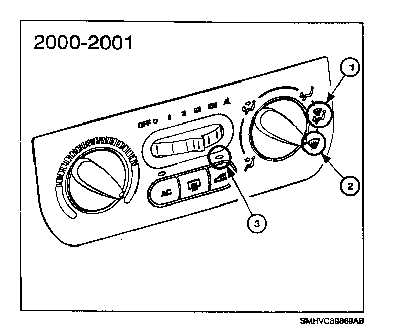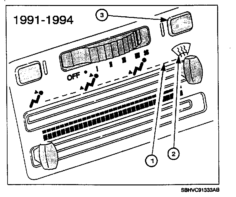 To keep the windows fog free, the climate control system knob should be positioned to Defrost/Heater mode (1) or Defrost mode (2). The Recirculate button should be left off (not depressed) so that indicator light (3) is not On. Use of Recirculate in cold weather is not recommended and can result in window fogging. In cold or humid weather, outside air is best for clearing the windows. To quickly clear the windows, put the fan control switch to high and push the "A/C" button (if equipped). For additional information regarding HVAC operation, refer to "Climate Control System" in the index of the owners handbook.
