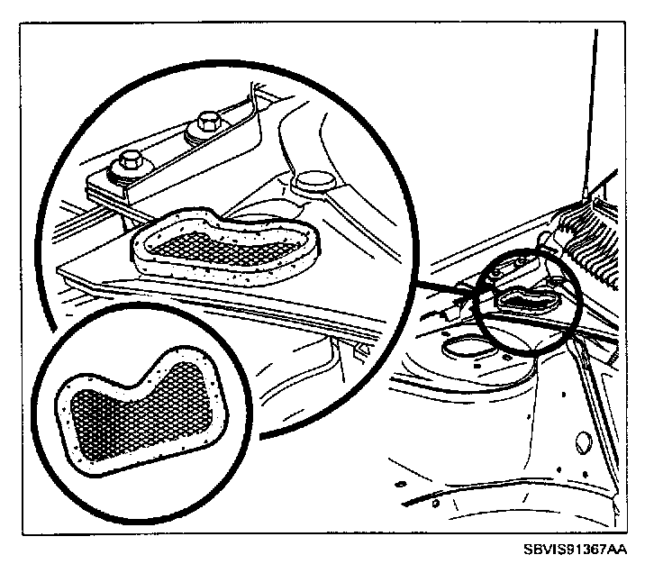 6. On 1997 2001 vehicles, remove both plenum drains. Use a stiff piece of wire and push wire through drain slot to verify that drain is clear.