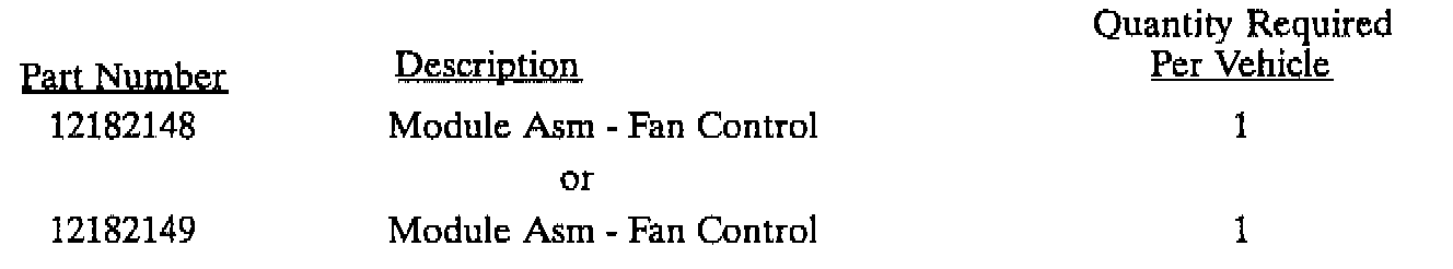 2. There is a unique cooling fan control module for 4 cylinder (L61) and 6 cylinder (L81) vehicles. The 4 cylinder part number is 12182149 and the 6 cylinder part number is 12182148. SSPO will provide the appropriate number of each cooling fan control module assembly based on the number and type of vehicles assigned to each Retailer.