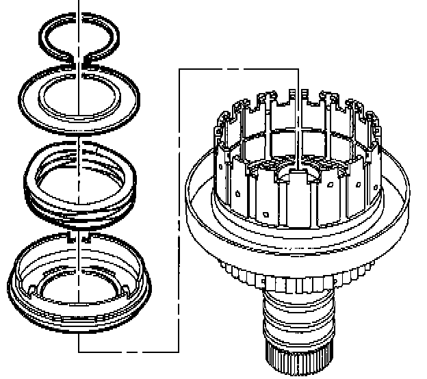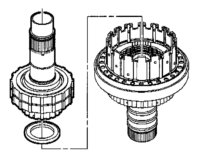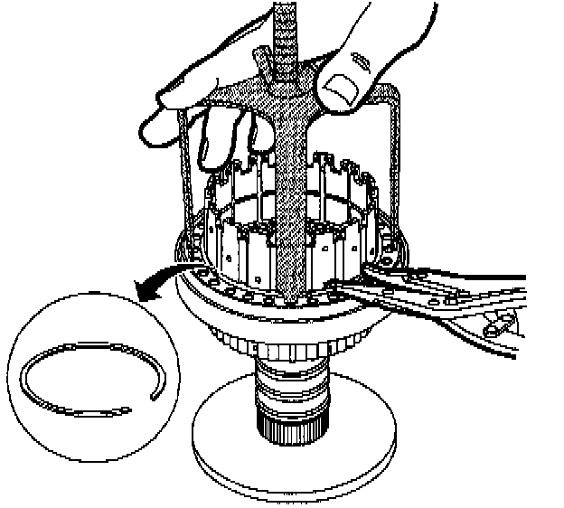 26. Assemble snap ring in order to retain the input sun shaft and sprag clutch assembly and the direct clutch plates.