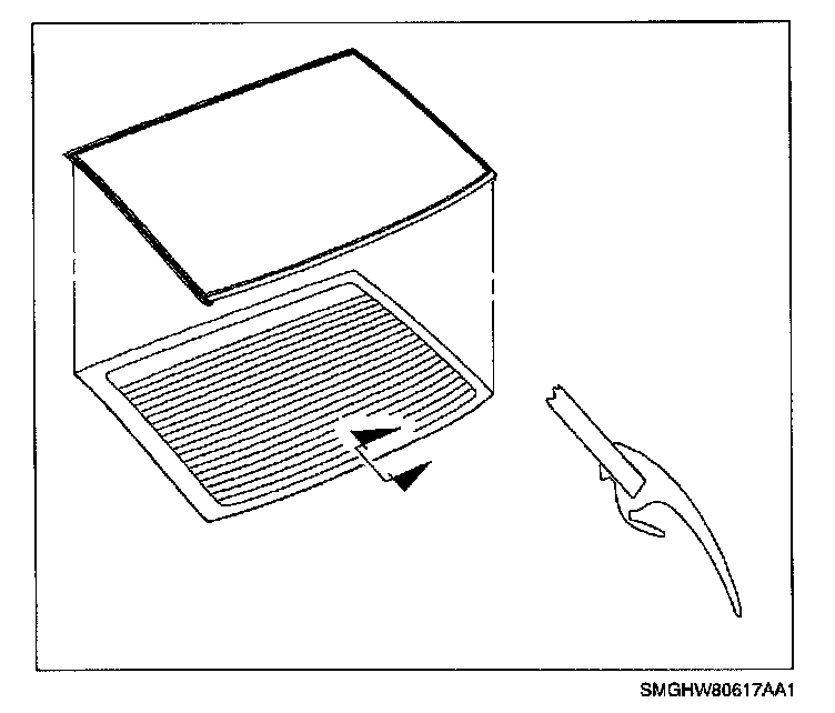 6. With power glass removal tool, cut urethane seal along roof down the sides and along the package shelf between the decklid hinges from inside of vehicle.