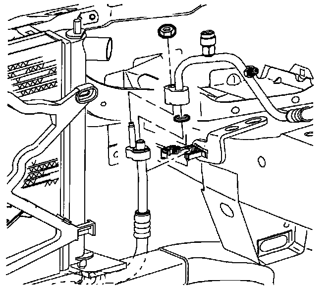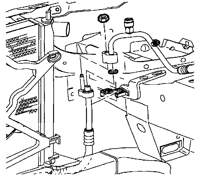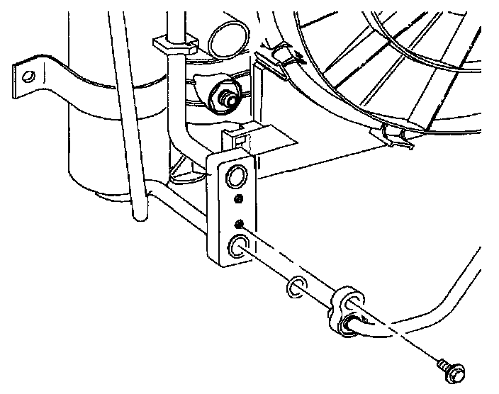 16. Remove condenser block to radiator end tank bolt.