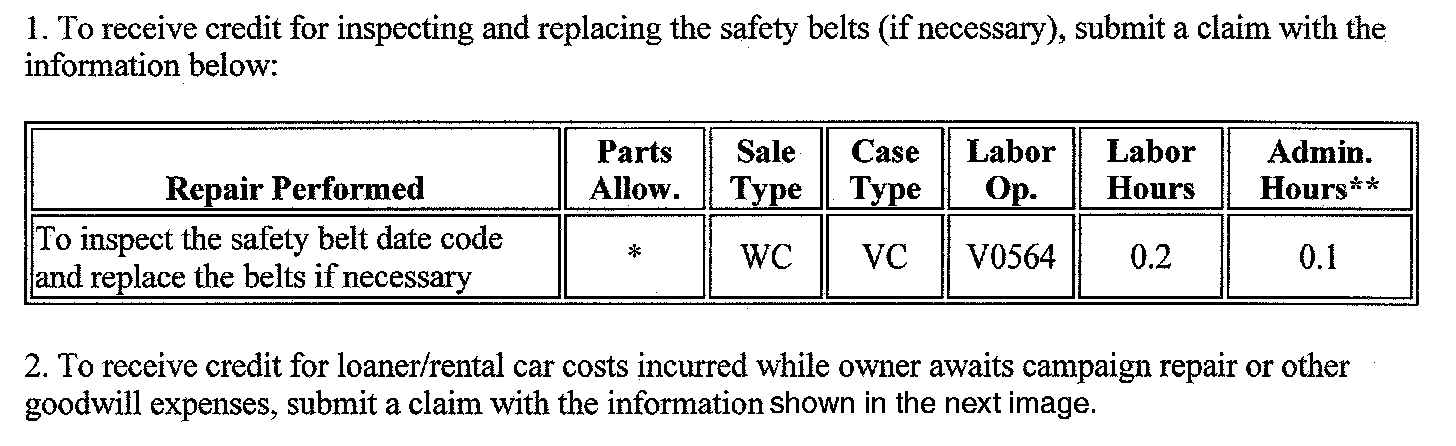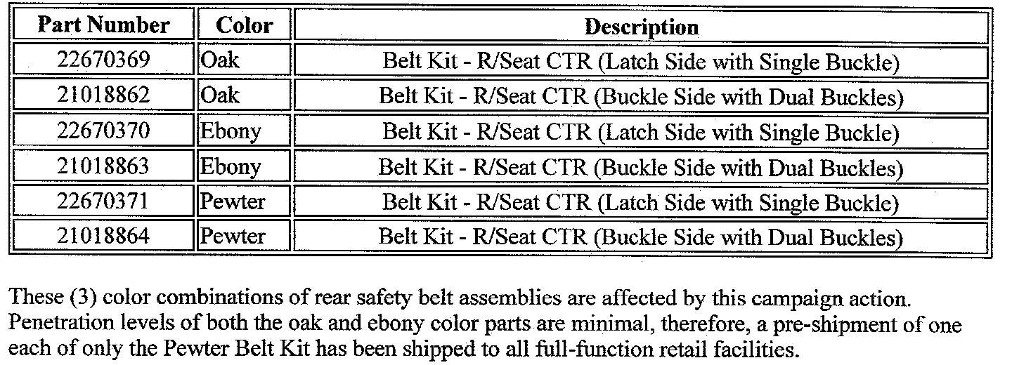 Customers are being instructed to inspect the date code on their safety belt buckle assemblies, and to call their retail facility if replacement is necessary. Since both COLOR and LOCATION information is needed to identify the correct replacement part(s) needed, retail personnel should gather enough information from the customer call to ensure the correct part is either ordered, or already in retail parts inventory. If the correct part is not already in parts inventory, SSPO will send all ordered parts via overnight delivery. Parts ordered by 3:00 p.m. CST will be shipped to arrive the following day. Please schedule appointments accordingly to minimize customer inconvenience.