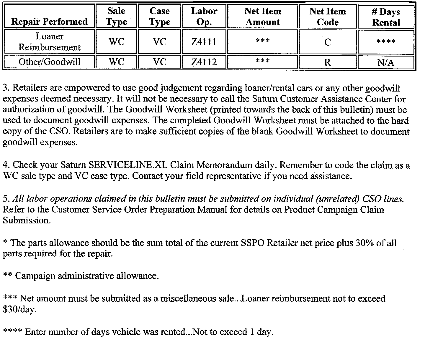 Complete the worksheet shown and attach it to the hard copy of the Customer Service Order (CSO) to document all campaign goodwill claims submitted to Saturn.