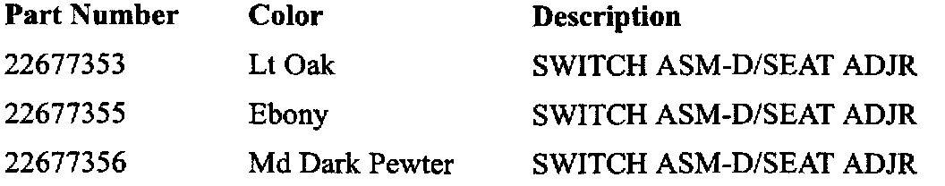 11. Snap new power seat switch into outer valance. Refer to Parts Requirements section in this bulletin for specific part information.