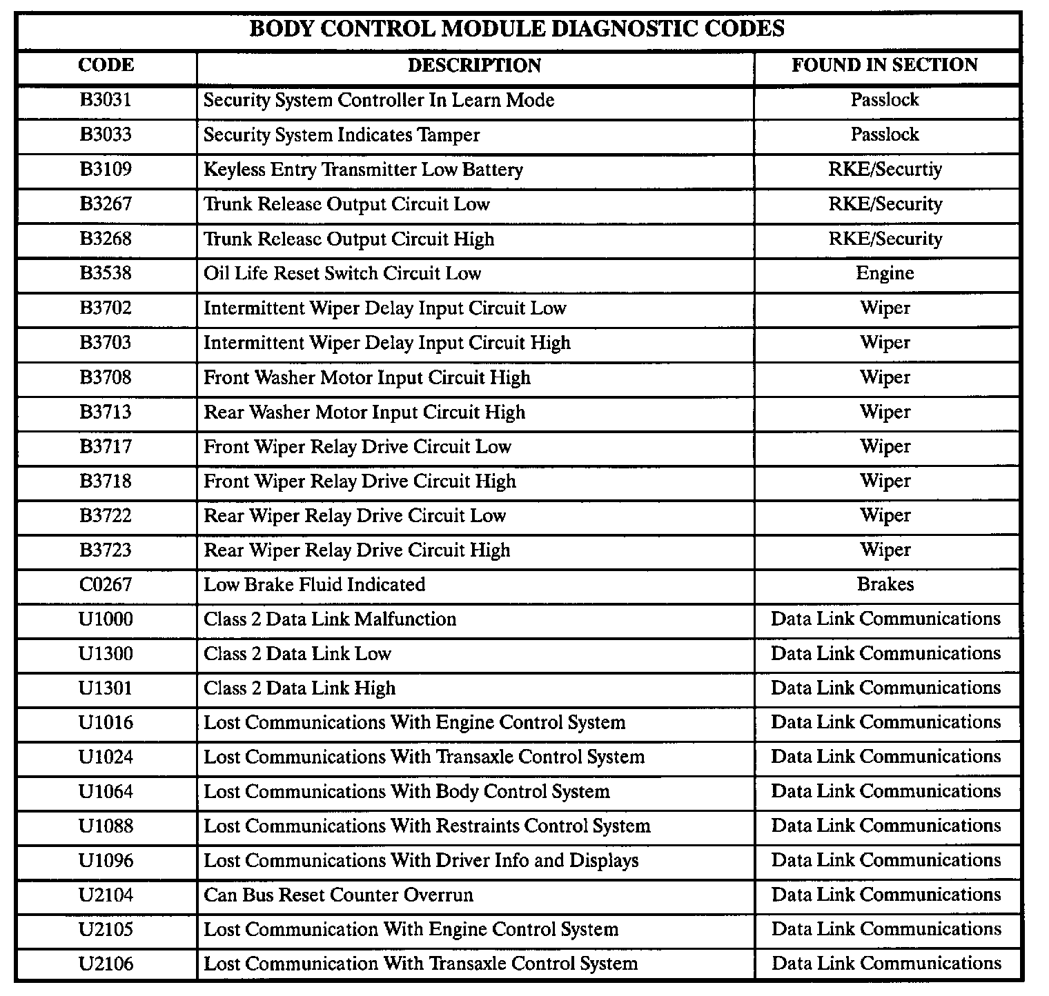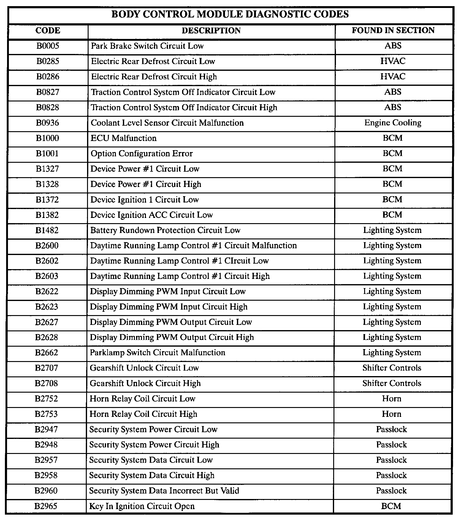 The table lists the body control module (BCM) diagnostic codes: