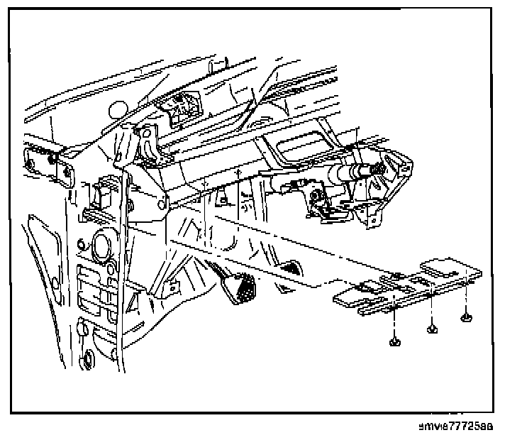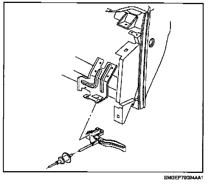 10. Unsnap hood release handle from instrument panel bracket by using two small screwdrivers to disengage retainer clip on both sides.