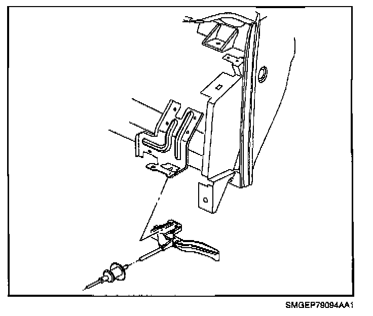 18. Insert the hood release cable through the oval core support pass-thru closest to the attaching clip mounting location only.