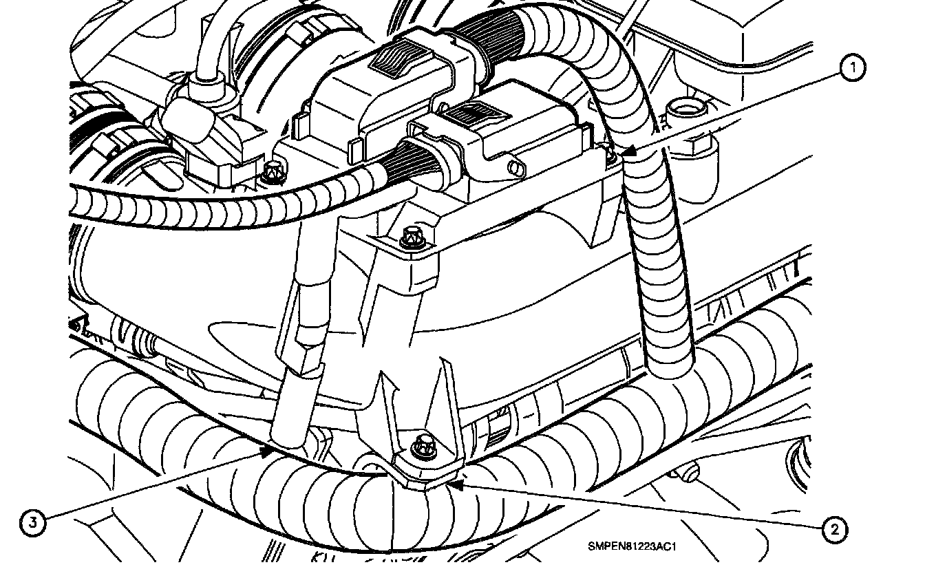 1. Inspect ECM engine wiring conduit at locations (1), (2), and (3) shown in illustration.