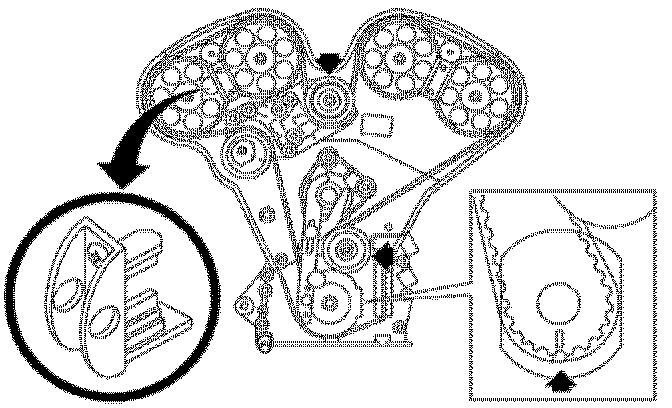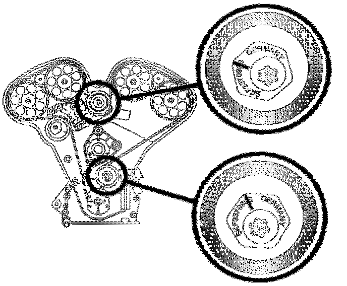 ^ Use Timing Belt Alignment Kit J 42069-1 and J 42069-2 to hold camshaft gears and camshaft in place while tightening camshaft gear bolts.