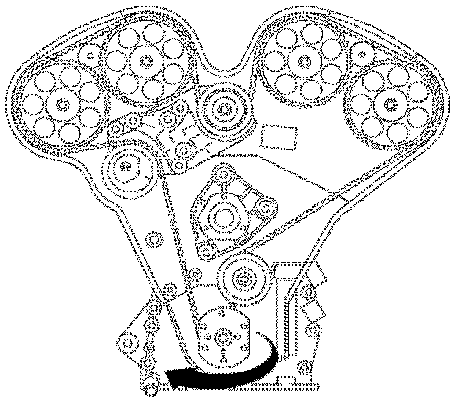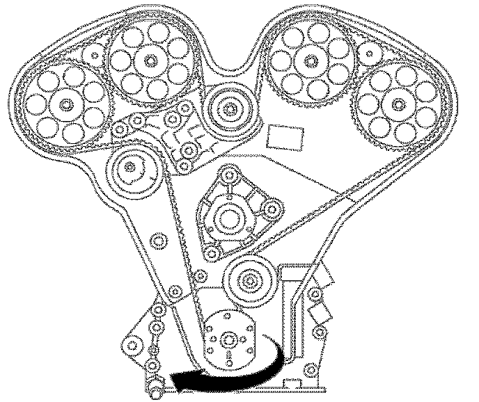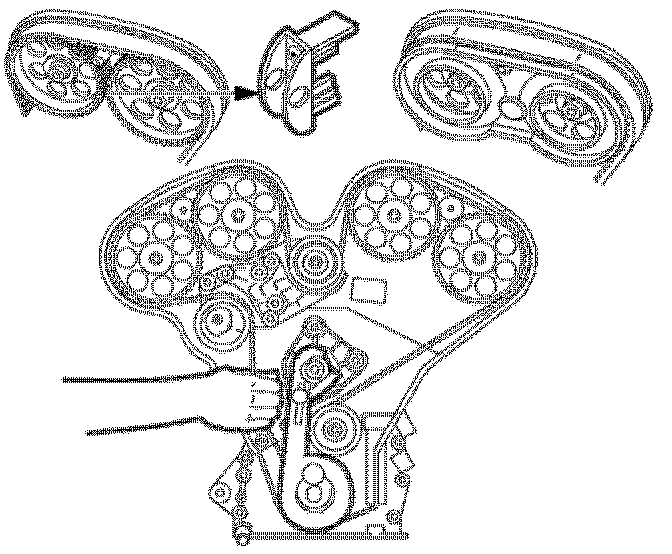 25. Pull belt between the timing belt tensioner and crankshaft sprocket to take up slack between cams 3-4 and the lower idler pulley.