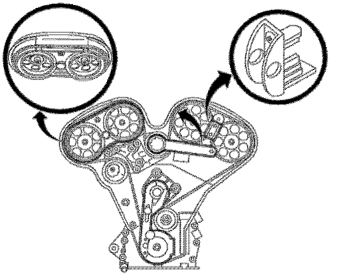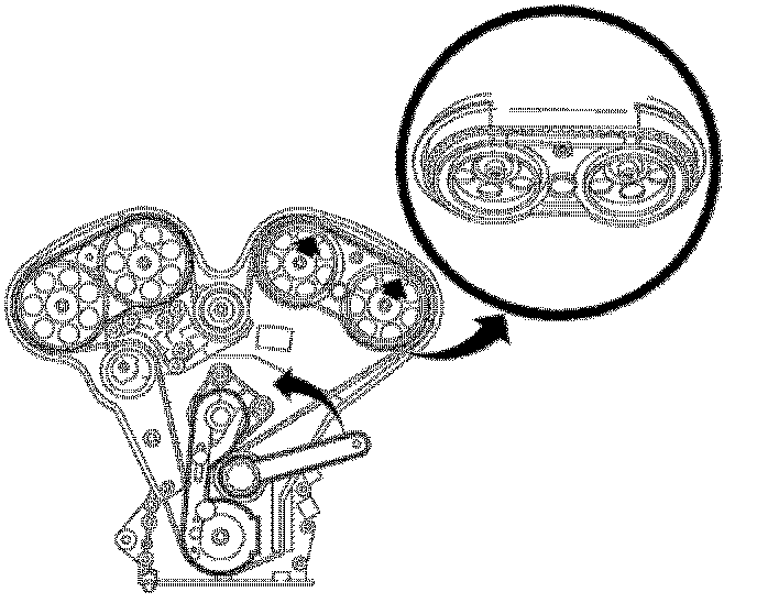 29. Adjust lower idler pulley by rotating counterclockwise until the 3-4 timing marks on the sprockets are lined up with marks on J 42069-20 checking gauge.