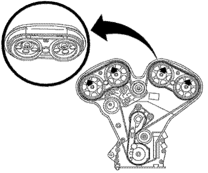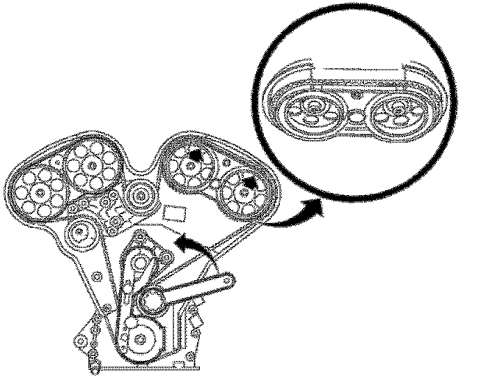 13. Align timing marks on each cam shaft sprocket with notch in rear timing belt cover.