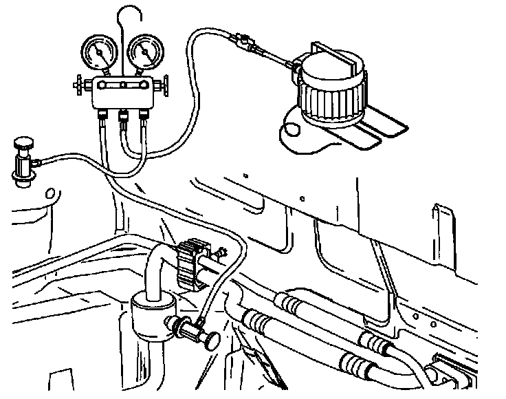 1. Connect refrigerant recovery and recycling station to high and low side service ports. Pull vacuum on system and evacuate for 20-30 minutes. Note vacuum gauge reading.