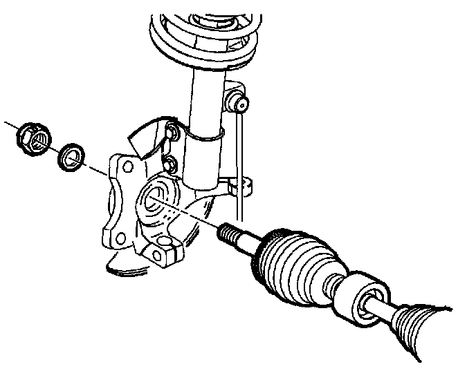 1. Position steering knuckle onto axle shaft and install axle to hub washer and a new nut.