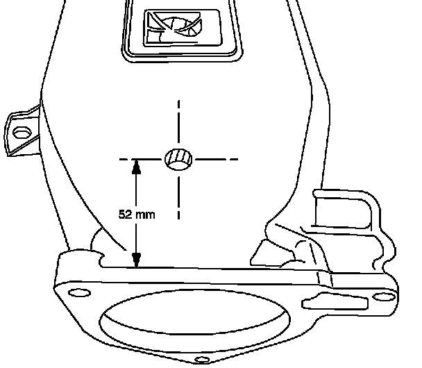 13. Drill a 2 mm to 3 mm (0.079 in to 0.118 in) pilot hole through the intake manifold located 52 mm (2.04 in) from front edge at throttle body end and centered so the hole is just in front of the center divider inside the manifold.