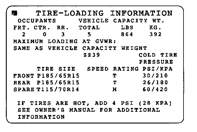8. Adjust cold tire inflation pressure according to tire loading information sticker located on the driver's door opening below the door striker (coupe), or rear edge of the driver's door (sedan and wagon).