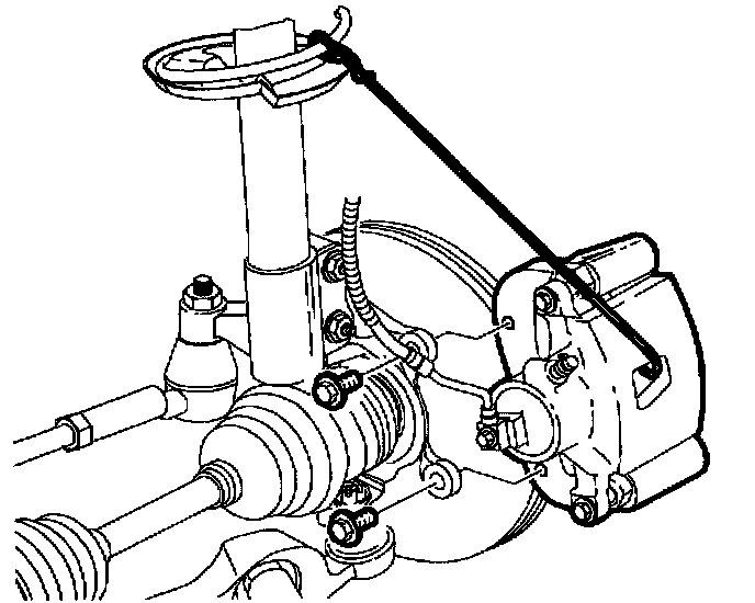 4. Remove caliper mount bracket-to-steering knuckle bolts, remove caliper assembly and suspend it from the strut spring with mechanics wire.