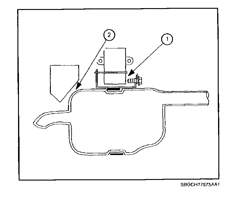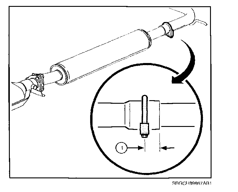 ^ Muffler hanger block should not contact hanger screw (1). If necessary, loosen muffler mounting strap, shift muffler mounting strap forward to eliminate contact, and retighten.