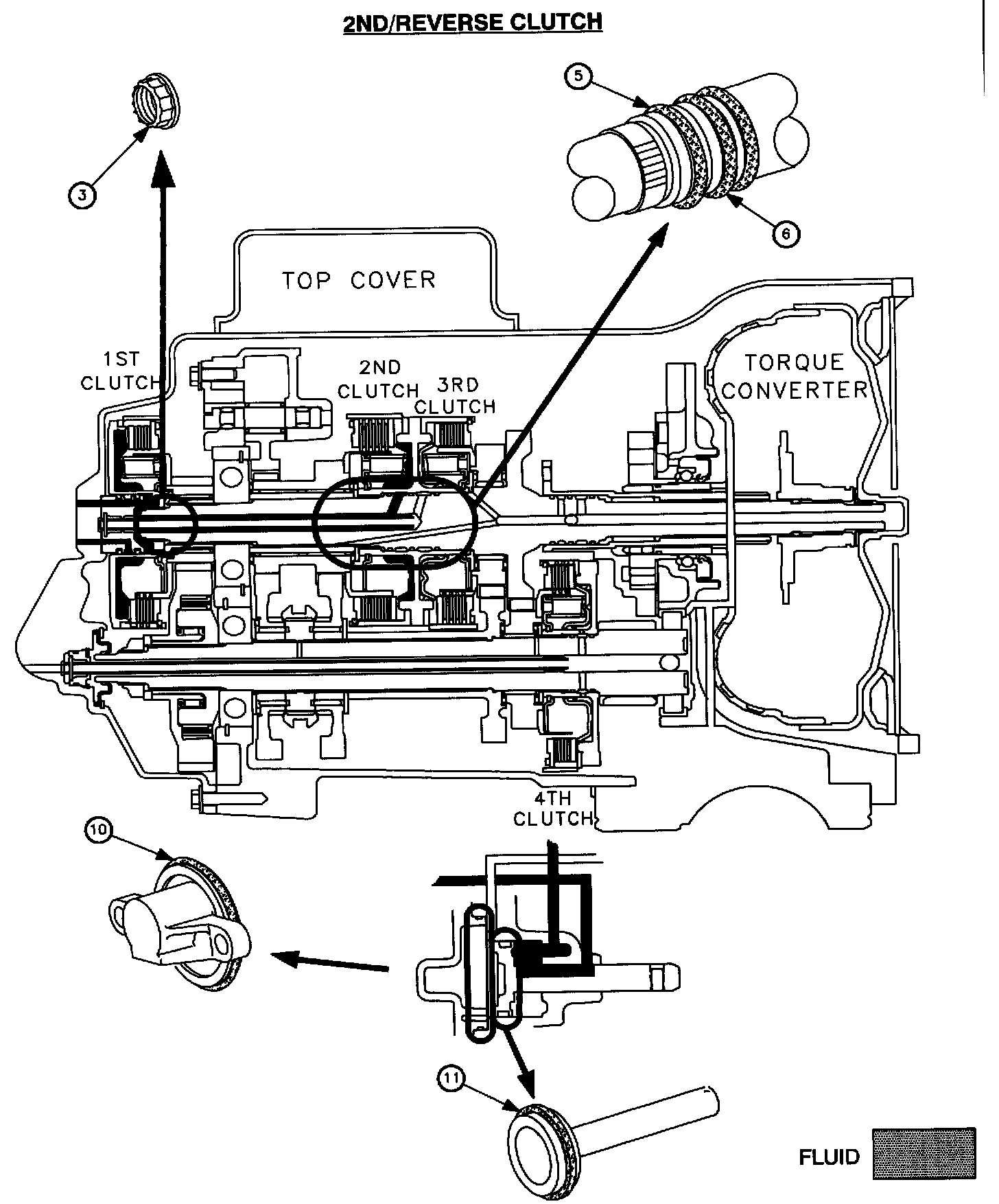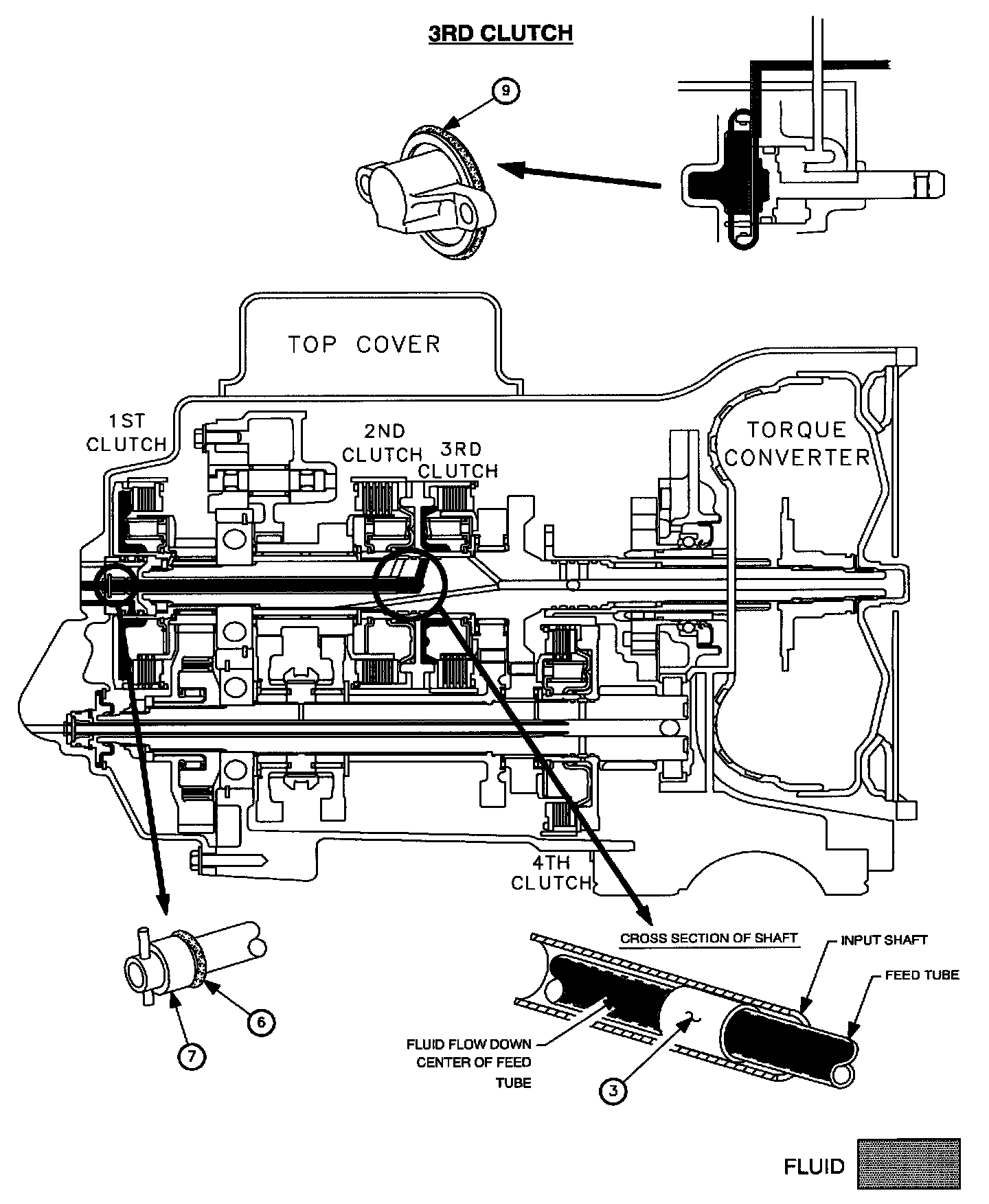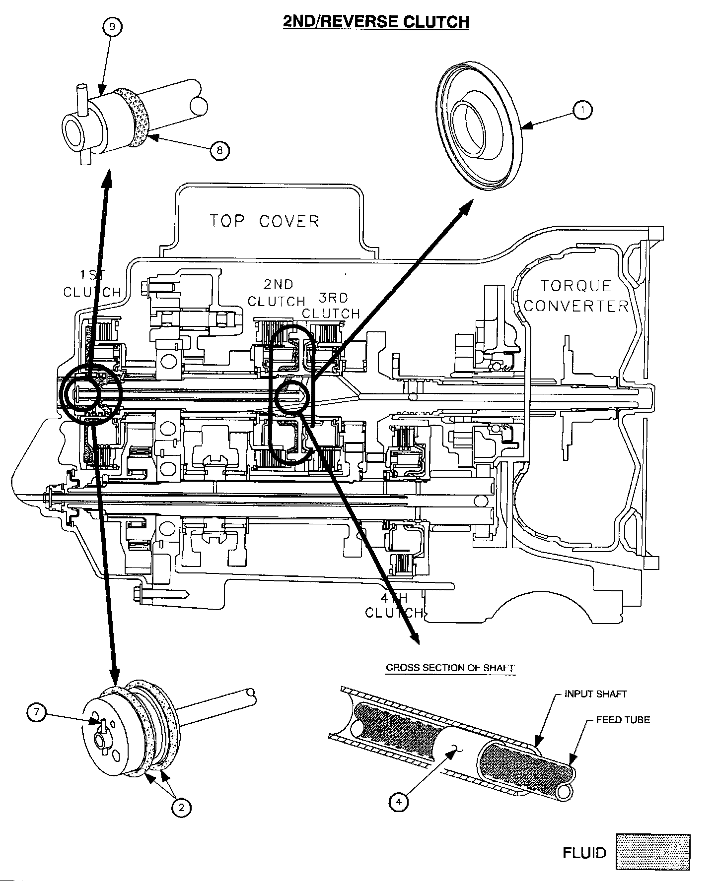 - Damaged clutch housing to input shaft O-ring seal between 2nd and 3rd clutches (6).