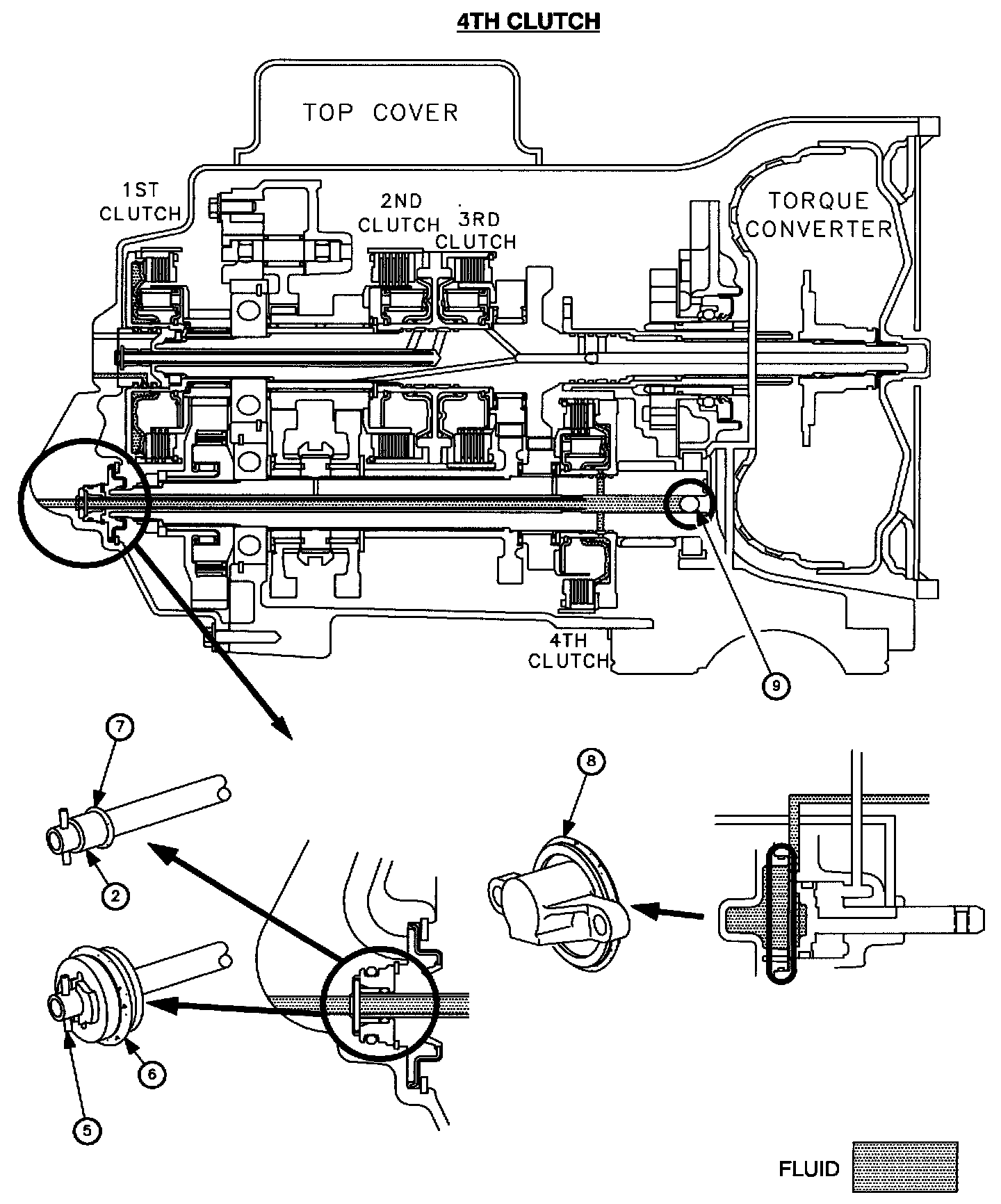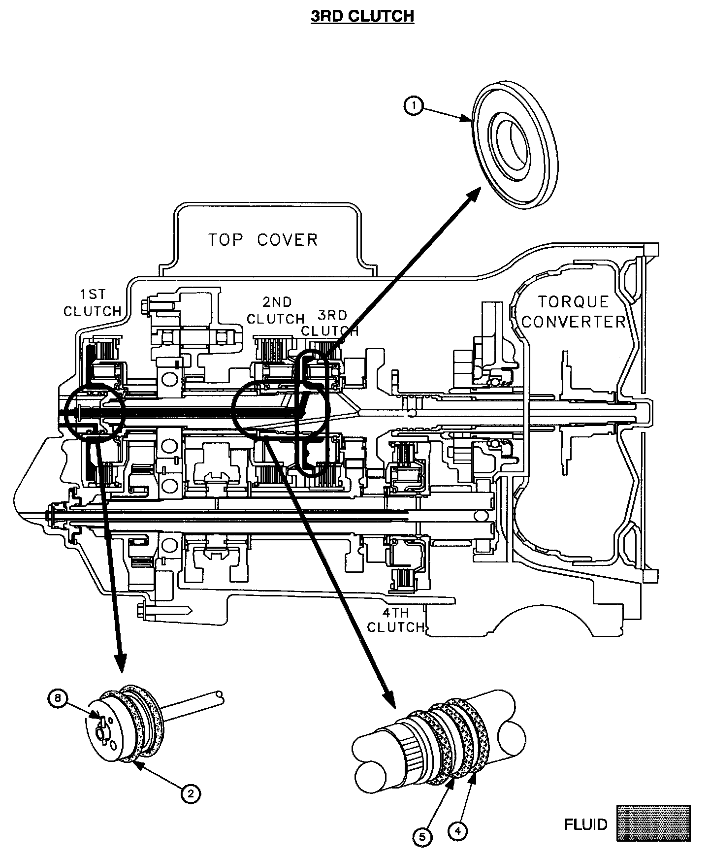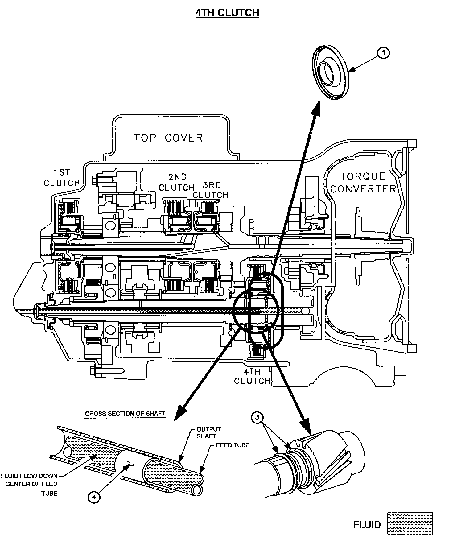 - Damaged clutch housing-to-input shaft O-ring seal under 3rd clutch (4).