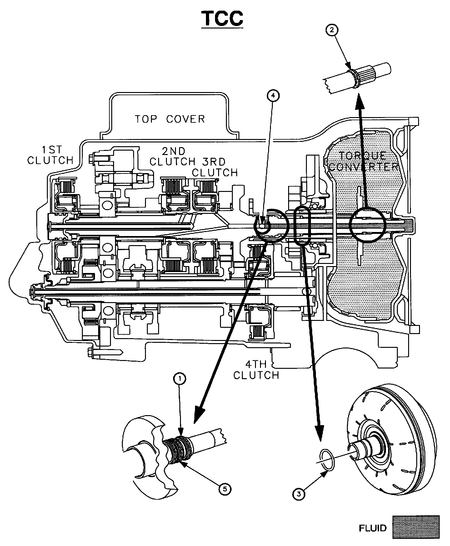 The TCC circuit cannot be checked reliably using air with the exception of checking for a missing input shaft check ball (4) or checking for a leaking Teflon (R) that separates lube from TCC disable (5).